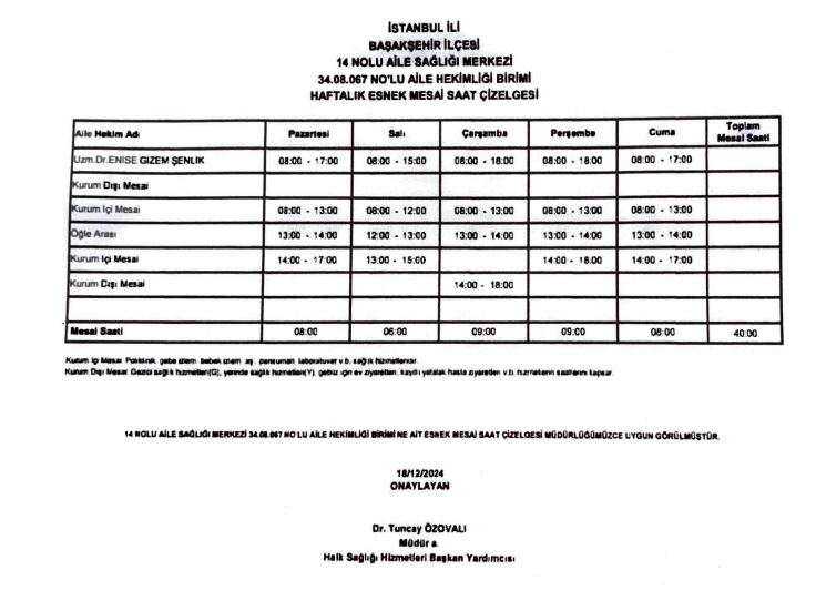 Dr. Enise Gizem Şenlik - Doktorun Çarşamba günü saat 14.00-16.00 arası kurum dışı mesaisi vardır. Doktor bu saatlerde Aile Sağlığı Merkezinde bulunmamaktadır.